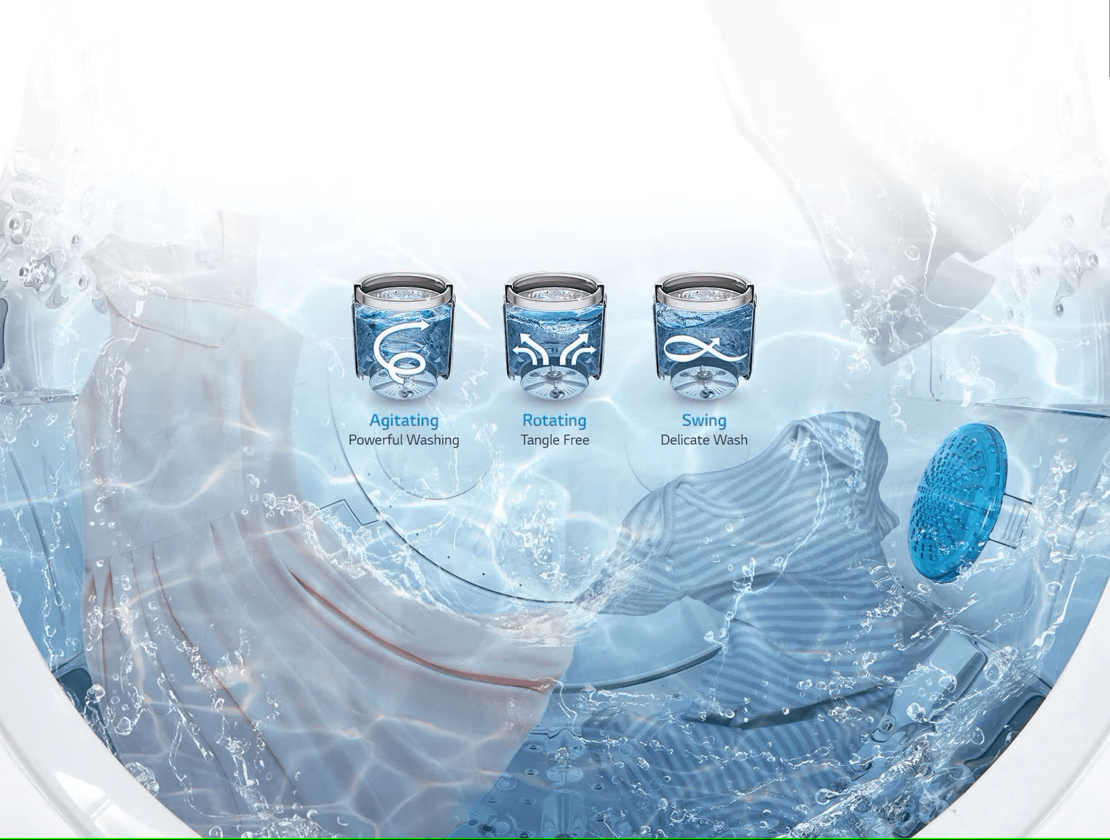 Punch+3 creates powerful streams of water which mix laundry up and down repeatedly for even washing result.